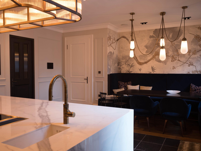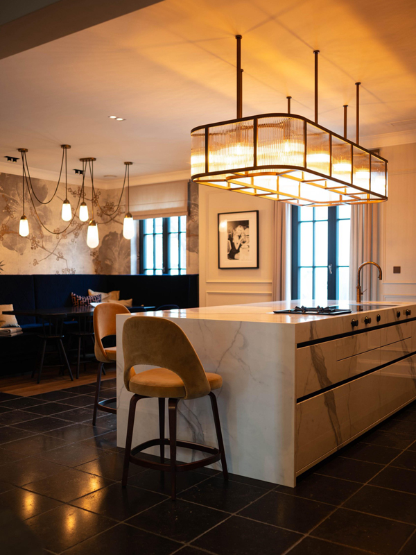 Die offen gestaltete Küche bildet gemeinsam mit dem Essbereich das kommunikative Zentrum der Villa. Hochwertige Materialien, maßgefertigte Einbauten und eine klare Formensprache schaffen eine harmonische Verbindung von Funktionalität und Wohnlichkeit. Licht, Proportion und Detailausarbeitung verleihen dem Raum eine warme, einladende Atmosphäre und unterstreichen den Anspruch an zeitlose Gestaltung.
